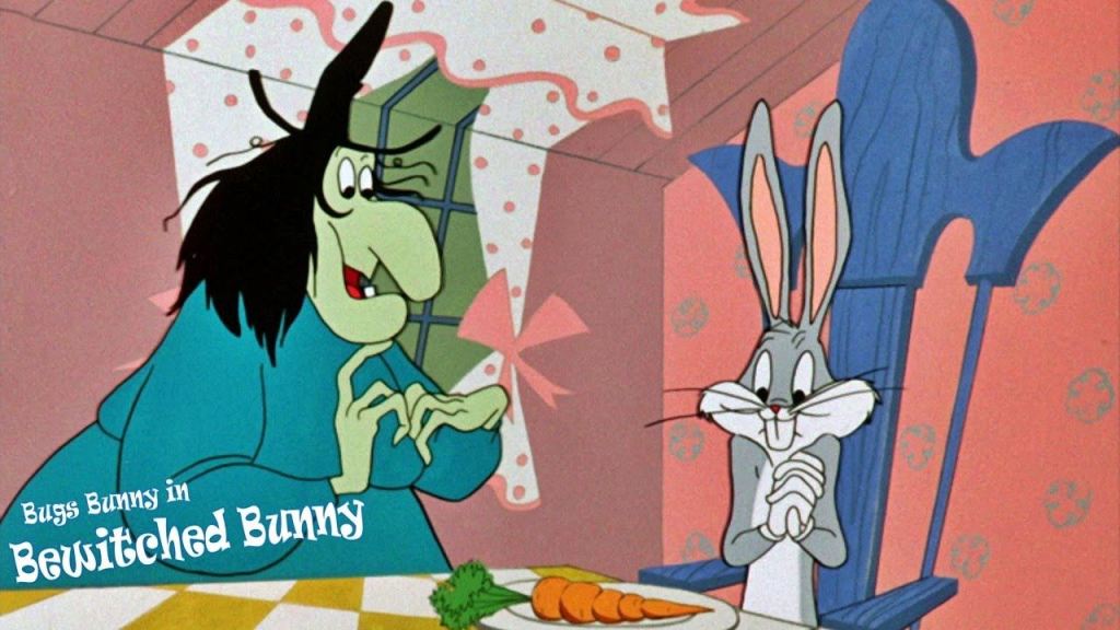 Like all the shorts featuring Witch Hazel, this one has a lot of funny lines (“Modesty is one of my girlish qualities;” talking about silly women drivers after she accidentally puts her broom into reverse and slams into a wall; giggling at Bugs calling her “Zsa Zsa”), and it’s a hoot picking out all the Shakespeare nods in the dialogue.