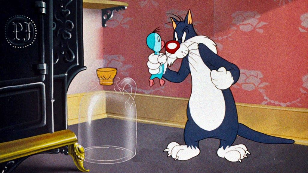 The bird sees Sylvester happily picking food out of a row of garbage cans as though it’s an all-you-can-eat buffet, but when he sees the bird, he’s super jazzed at a fresh kill. It only takes him a moment, though, to realize that the bird actually wants to be eaten, at which point he becomes suspicious that the bird is poisoned. The bird is bound and determined to be eaten by Sylvester, and Sylvester is just as adamant that if he eats the bird, he’ll die. So the whole short becomes a kind of war of attrition, where the bird continually tries to come up with ways to insert himself into the cat’s mouth, and the cat has to try to keep him out, all the while getting angrier and hungrier, since every time he tries to eat something else, the lovebird tries to fly inside.