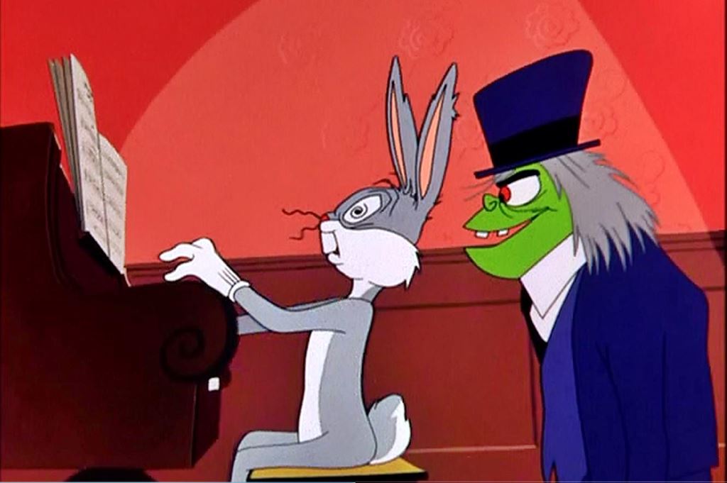 The monster comes up behind Bugs, who has been very skillfully playing Chopin’s “Minute Waltz” (which he pronounces as My-noot Waltz by Choppin’) on the piano, and Bugs, sensing the danger, starts freaking out and playing the piano all discordant. The monster tries to kill Bugs with an axe, but Bugs manages to run away, yelling for the doctor, as he thinks the monster is a patient who REALLY needs medical attention.