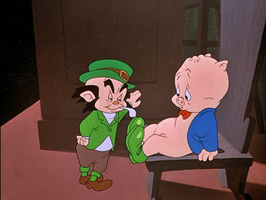 Yet another short where Porky gets himself into dangerous shenanigans due to being completely clueless, “The Wearing of the Grin” has the pig on a business trip in Ireland. En route to Dublin, he gets caught in a storm, and decides to seek shelter in a creepy, isolated castle with a sign out front warning passersby to “Beware the Leprechauns.” Of course Porky doesn’t truck with any of that blarney, so he steps right up to the castle and bangs on the enormous front door with the shamrock-shaped knocker.